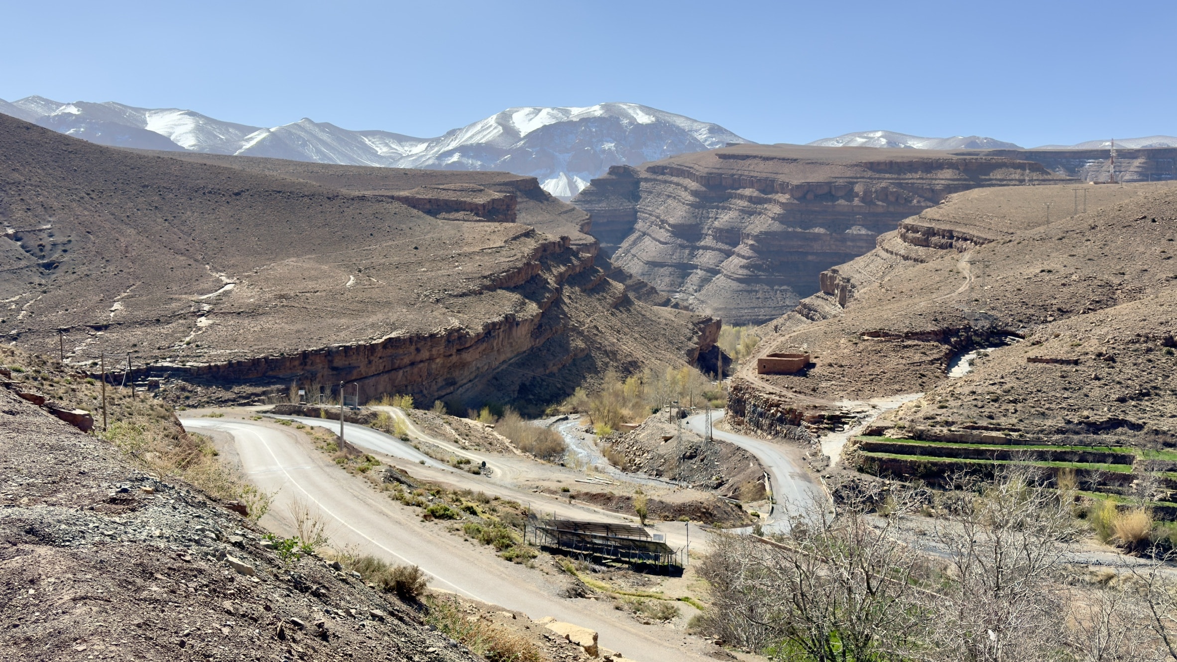 O contraste faz-se sentir rapidamente à medida que ganhamos altitude e entramos novamente em zonas montanhosas. A paisagem muda, surgem vales, formações rochosas e uma estrada mais envolvente que acompanha o relevo do Médio Atlas.