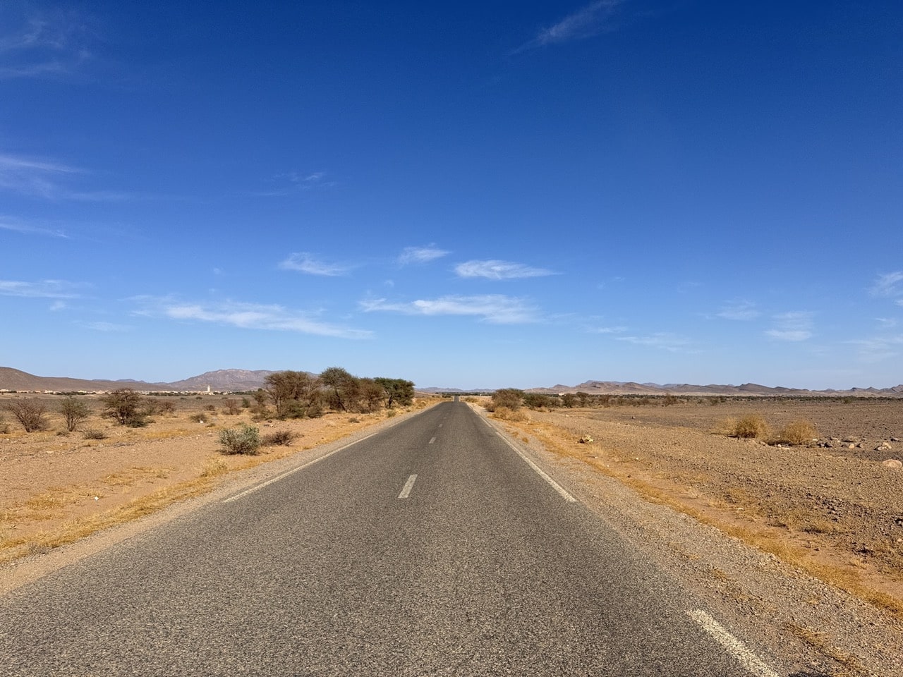 Saída de Merzouga ao início do dia, deixando para trás as dunas e o ambiente do deserto.