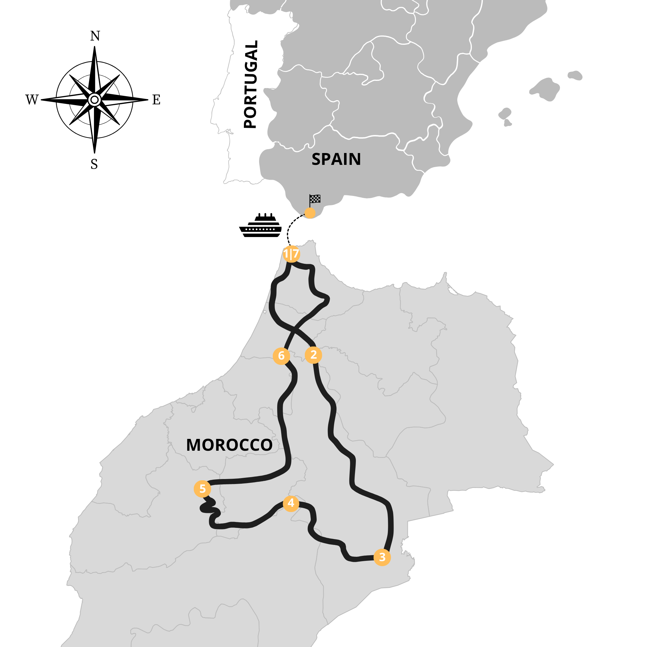 Despedimo-nos de Marrocos com o coração cheio de memórias e paisagens que ficarão para sempre gravadas. Após o pequeno-almoço, seguimos em direção ao porto, onde termina esta inesquecível travessia pelo Reino. O regresso é tranquilo, com a certeza de que cada quilómetro percorrido contou uma história de descoberta, amizade e aventura.