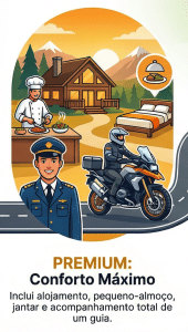 Deves levar apenas o essencial, de forma prática e organizada. Ao longo da viagem fazemos abastecimentos nos momentos ideais e sempre em locais seguros, garantindo que rolas com tranquilidade e sem preocupações. Antes da partida, envio-te todas as indicações para preparares a tua bagagem da melhor forma.